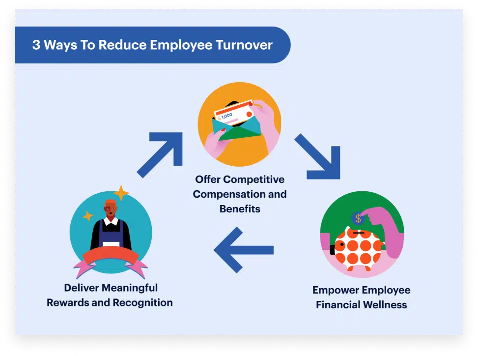 To reduce your employee turnover rate, your company should focus on supporting employees through competitive benefits and pay, a good work-life balance and room for career growth.